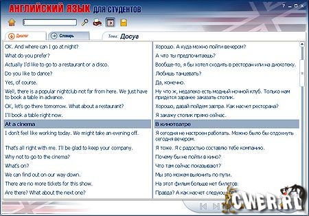 Курс рассчитан на студентов, выезжающих на учебу за рубеж, и всех тех, кому необходимы разговорные навыки. Удобный интерфейс, управление звуком, печать всех материалов курса, возможность прослушать и сохранить звуковой материал в формате для мобильных телефонов делают данный курс максимально полезным для всех, кто желает улучшить свои знания английского языка.