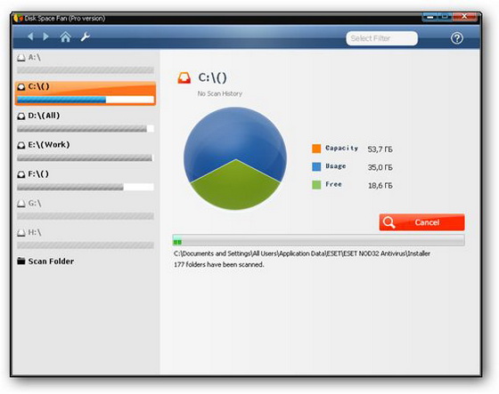 Disk Space Fan - не просто инструмент для поиска файлов-дубликатов, но также и анализатор свободного места на диске. Программа быстро найдет и удалит большие и ненужные файлы. Она показывает свободное место диска на диаграмме в виде цветка. Используя фильтры, вы сможете найти определенные файлы. Также Вы сможете использовать статистику по аудио и видео файлам.