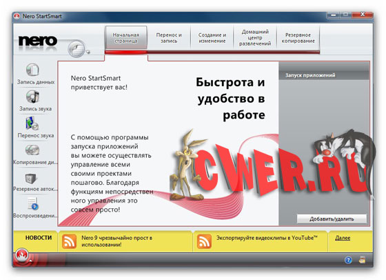 Nero Burning ROM - cамый свежий набор программного обеспечения цифрового мультимедиа и домашнего центра развлечений следующего поколения, которое пользуется наибольшим доверием в мире. Его характеризует передовая функциональность, благодаря которой наслаждаться цифровым мультимедиа так просто. Этот простой в использовании, но мощный набор мультимедиа дает вам свободу создавать, считывать, копировать, записывать, редактировать, совместно использовать и передавать данные в сети. Что бы это ни было — музыка, видео, фото или данные — наслаждайтесь ими и используйте совместно с родными и близкими когда угодно и где угодно. Ваша цифровая составляющая жизни еще никогда не была такой свободной, ощутимой и веселой, как с простым в использовании командным центром Nero StartSmart.