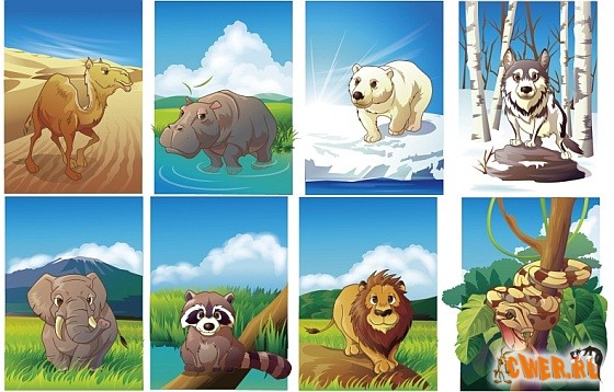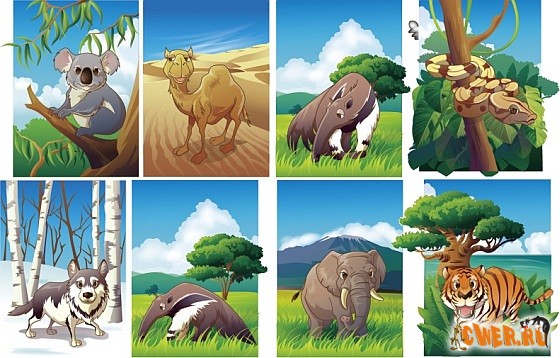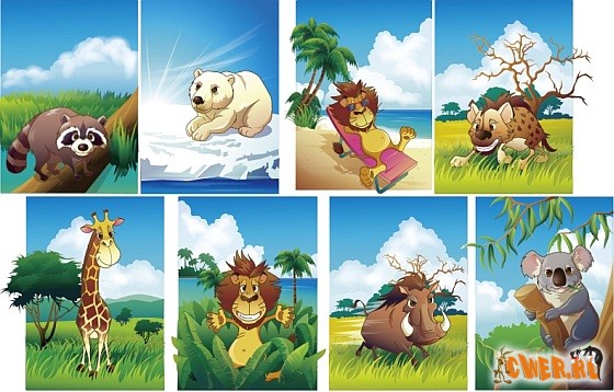 Красочная векторная графика с представителями дикой фауны в естесственном антураже.