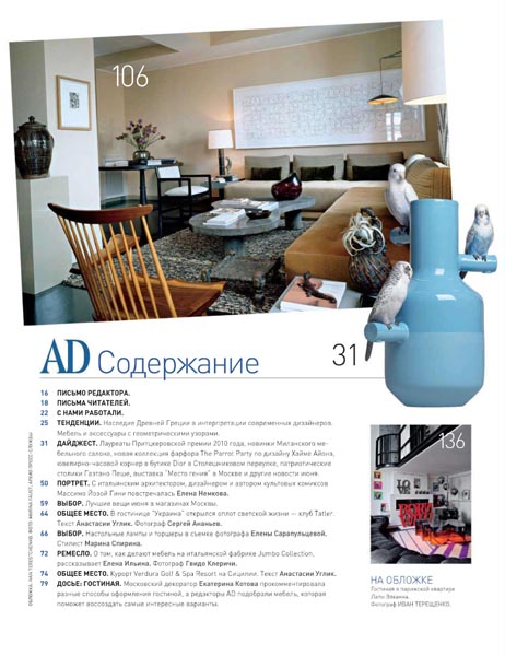 Журнал AD (Architectural Digest) — ведущий международный журнал об архитектуре и дизайне. Издается в Америке с начала 20-х годов, в России с сентября 2002 года. За долгие годы завоевал репутацию законодателя интерьерной моды, сформировал вкусы нескольких поколений , источник вдохновения в искусстве создания идеального жизненного пространства.