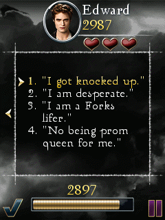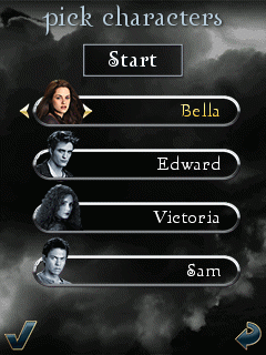 У вас появился шанс показать, насколько хорошо вы знаете содержание одноименного фильма и вновь пережить все любимые моменты из него! Выбирайте своего любимого персонажа фильма: Бэллу, Эдварда, Элис или Джейкоба, и устройте захватывающее состязание, играя в одиночку или с друзьями. Узнайте, кто из вас самый главный фанат «Сумерек»! Размеры экранов: 128x128, 128x160, 240x320.