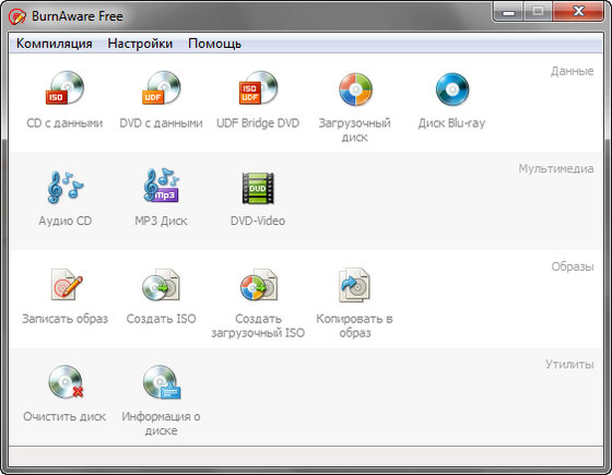 BurnAware Free - относительно небольшая, бесплатная и простая в использовании программа для записи информации и музыкальных композиций на CD, DVD, Blu-Ray и HD-DVD диски, которая пригодится как опытным пользователям, так и новичкам. BurnAware поддерживает работу со всеми типа оптических дисков (включая CD-R/RW, DVD-R/RW, DVD+R/RW, BD-R/RE, HD-DVD-R/RW и DVD-RAM) и аппаратными устройствами записи. Утилита поддерживает создание образов, способна писать мультисессионные диски, имеет опцию проверки записанного содержимого.