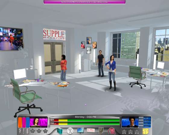 Вы играете роль Эйрин Костелло - редактора стиля в модном журнале Supple. Покупайте, сплетничайте, флиртуйте, продвигайтесь по карьерной лестнице. Оставайтесь в хороших отношениях с боссом. Пишите статьи, обедайте, меняйте одежду, чтобы впечатлить всех. Соревнуйтесь с Тревором Симонсом, победитель получит гламурный загородный дом босса, а проигравшему придется искать новую работу.