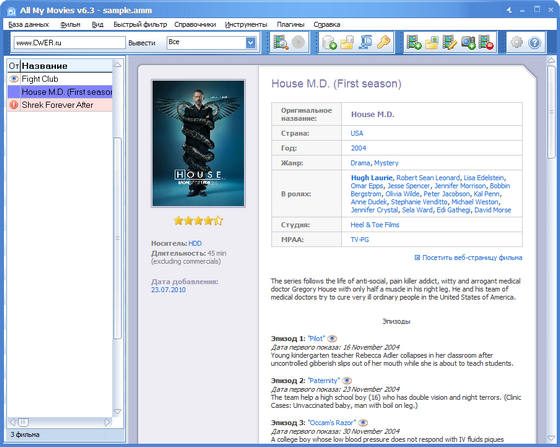 All My Movies - программа для тех, у кого большая коллекция различных фильмов, нуждающихся в систематизации. Это простой в использовании инструмент для создания каталога вашей коллекции видео. Не важно, на каком носителе находятся ваши фильмы, будь то DVD, CD, VHS кассеты или что-нибудь еще...