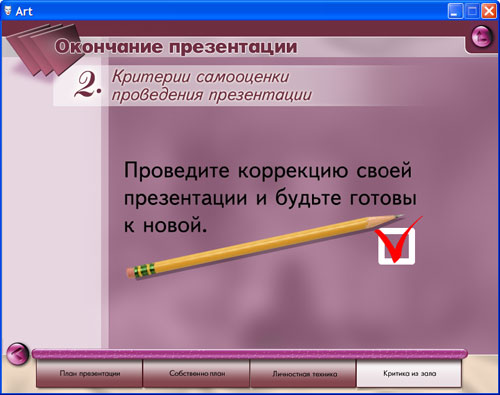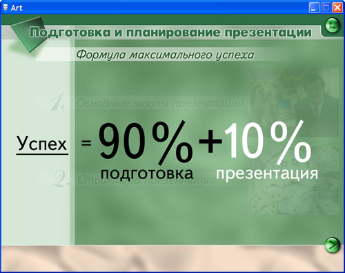 Данный мультимедийный курс призван исправить этот недочет. В тренинге охватываются и последовательно рассматриваются все этапы подготовки и проведения презентации как искусства. Большое внимание уделено распространенным промахам ораторов, ошибочным жестам и манере поведения докладчика. Наглядно представлены основные методические схемы. Обилие разнообразных практических ситуаций, наглядность, применение активных методов обучения и, наконец, возможность многократного использования данной обучающей программы делают этот продукт незаменимым инструментом в арсенале любого новичка и профессионала в области активного бизнеса, торговой и производственной практики.