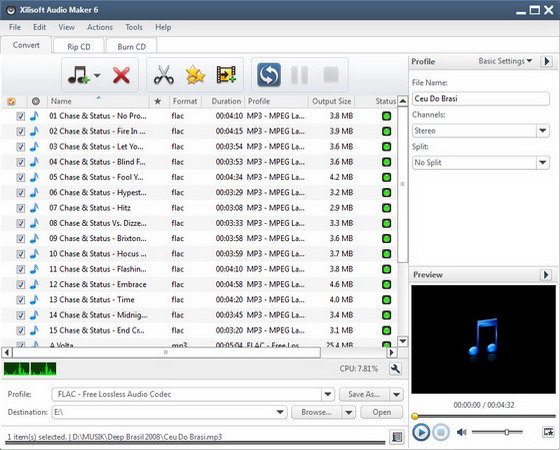 As integrated audio maker software, Xilisoft Audio Maker is absolutely your best choice to convert among all audio files, rip/convert CD to MP3 and burn audio CD to assist you to complete all tasks of audio converter, audio creator, CD to MP3 ripper, M4A creator and audio CD burner.
