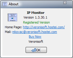 Veronisoft IP Monitor - является программным обеспечением для контроля сети, которое позволяет Вам проверять возможность соединения TCP/IP хостов в Интернете и LAN. Программа периодически пингует или проверяет порты TCP у заданных компьютеров или других устройств сети. Также позволяет искать IP-адрес и информацию об имени хоста в DNS.