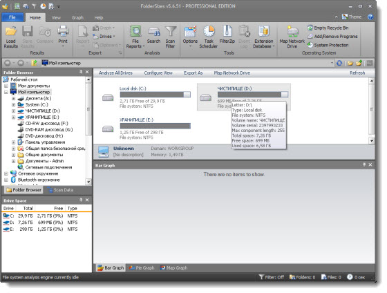 - Просмотр общего и свободного пространства для стационарных, съемных и сетевых дисков