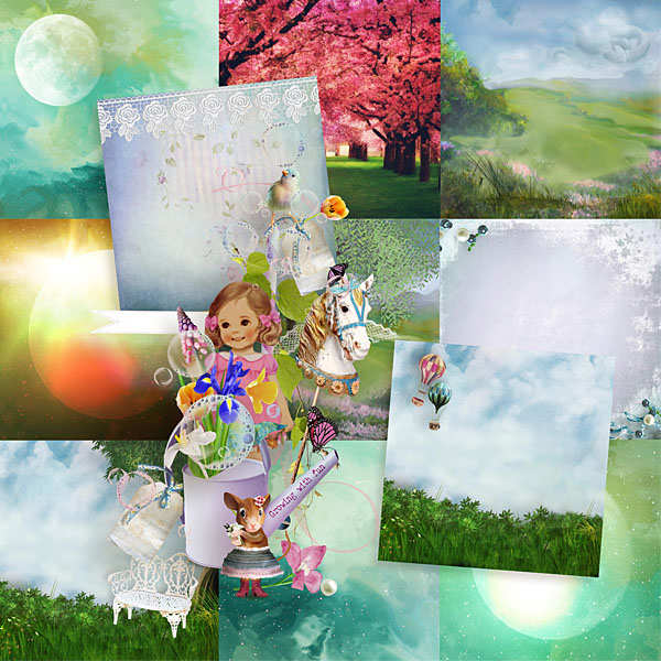 Скрап-набор с большим количеством красивых элементов и красочных фонов для работы в фотошопе. Забавные мышки, птицы, карусели, фарфор, воздушные шары и змеи, цветы и многое другое.