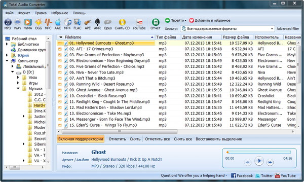 Total Audio Converter подходит как для профессионалов, так и для новичков. Интуитивно понятный двухпанельный интерфейс поможет Вам, даже если Вы никогда раньше не конвертировали аудио файлы. Все, что Вам нужно сделать, выделить исходный файл (или файлы) и нажать кнопку с конечным форматом. Далее появится окошко помощника, который соберет всю необходимую информацию (куда положить сконвертированный файл, какие параметры конвертации использовать). Более того, программа сама предложит Вам наиболее подходящие параметры.