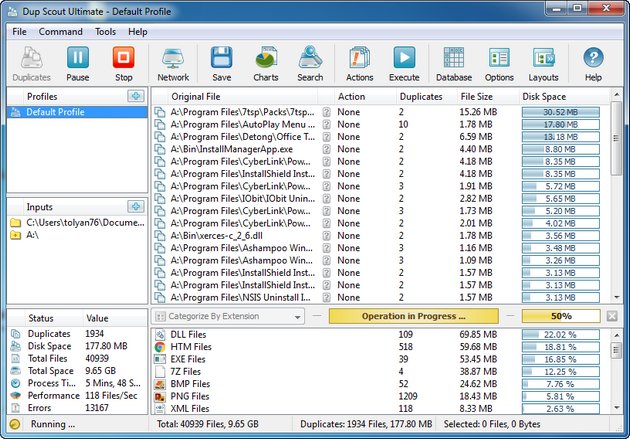 Программа сканирует указанный диск и находит на нем все одинаковые файлы, при этом она предоставляет подробную статистическую информацию о количестве дубликатов, занимаемом им месте на диске и пр. Она также сортирует все файлы по категориям, и строит на основе собранных данные наглядные круговые диаграммы. DupScout дает пользователям возможность выбора действия, применяемого к выбранному дубликату (удаление, перемещение, создание ссылки). После выполнения очистки, программа создает подробный отчет, который можно сохранить в HTML, CSV или текстовый файл.