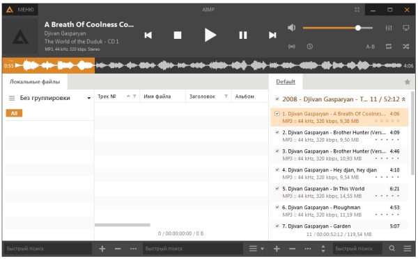 AIMP – проигрыватель, включающий в себя множество дополнительных модулей: CD-Ripper, Tag Editor, Audio-player, аудио конвертер, запись аудио и дисков с данными и т.д. Воспроизводит множество аудиоформатов, включая WAV, MP3, MP2, MP1, OGG, WMA, UMX, не нуждаясь в дополнительных кодеках. Имеет стильный многоязычный интерфейс.