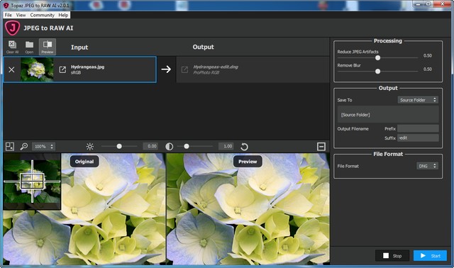 Topaz JPEG to RAW - редактируйте фотографии снятые в JPEG формате как будто бы они сняты в RAW. Используйте искусственный интеллект для преобразования JPEG в высококачественный RAW для лучшего редактирования. Избегайте искажений, уберите удаление артефактов сжатия, восстанавливайте детали и расширяйте динамический диапазон.