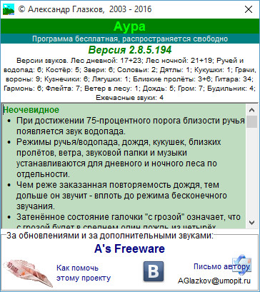 "Аура" — это программа, которая создает на вашем компьютере звуковую атмосферу дневного и ночного леса. Достаточно одного щелчка по значку, чтобы выключить или включить воспроизведение. Пульт управления, вызываемый правым кликом по значку, позволяет настроить активность птиц, цикад, ручья, водопада, дождя, грома, костра, зверей, флейты, гитары, скрипки, виолончели, назначить автоматическую смену аур (с заданной периодичностью или в соответствии с временем суток), задать автоматический старт программы при включении ПК, выбрать автоматическое выключение компьютера в заданное время (для любителей засыпать под умиротворяющие звуки леса).