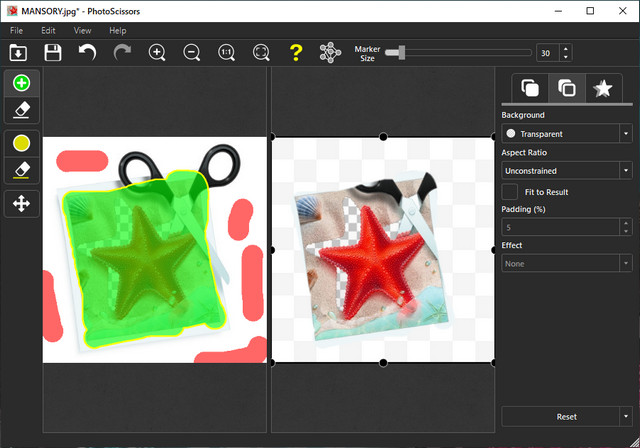 PhotoScissors - очень простой способ, чтобы избавиться от фона изображения. Вместо того, чтобы точно обводить контур в громоздких профессиональных графических редакторах, вы быстро отмечаете области, которые необходимо вырезать или сохранить и программа автоматически сделает все остальное. Благодаря оптимизированному анализу отсечения краев, вам не придется охотиться за каждым пикселем. PhotoScissors очень пригодится, когда нужно быстро вырезать лицо или объект, а также для удаления фона из фотографии.