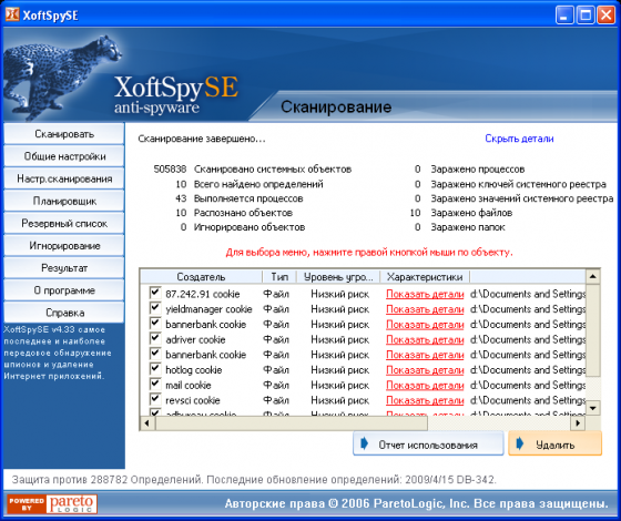 Одним из преимуществ XoftSpy является высокая скорость сканирования, плюс регулярные обновления через интернет, что особенно важно для утилиты, основное предназначение которой заключается в обеспечении безопасности пользователя.