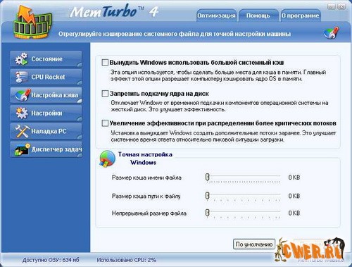 Утилита для ускорения работы компьютера. Программа дает возможность управлять загруженностью процессора, временно отключать компоненты операционной системы, которые используют файл подкачки, производить настройку приложений, работающих в режиме ожидания и т.д.