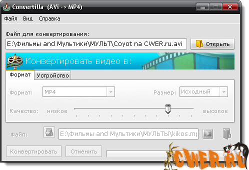 Convertilla это простая и удобная программа для конвертирования видео и музыки из одних форматов в другие. Поддерживаются: MP4, FLV, MKV, MPG, AVI, MOV, WMV, 3GP, MP3.