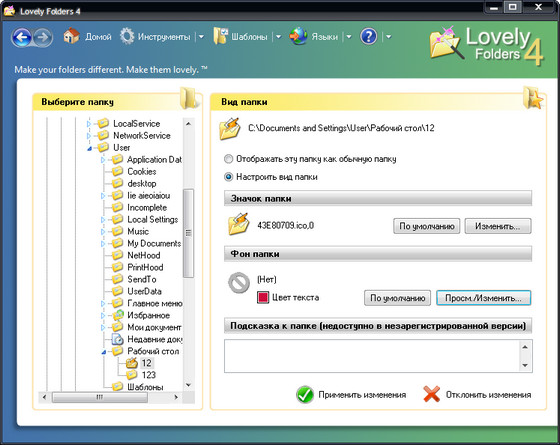 Lovely Folders - программа для настройки ваших папок Windows. Используя эту удобную утилиту, Вы можете заменить стандартный значок папки для индивидуальных папок на любой привлекательный значок, выбранный из сотен встроенных красочных значков или произведенный автоматически внутренним IconConverter в зависимости от содержания папки (музыка, видео, изображения, и т.д.). Кроме того, Lovely Folders могут изменить фон папки! Ваши индивидуальные папки теперь могут иметь фоновое изображение — точно так же как ваш рабочий стол.