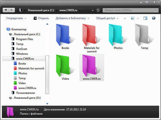 FolderHighlight - утилита для выделения особых папок любым цветом. Мы принимаем около 80% всей информации визуально, глазами. При просмотре десяток визуально-похожих папок, пользователь не использует свое зрение в полном объеме, таким образом ваша деятельность становится менее эффективной, чем могла бы быть. Но если каждой папке придать свой цвет или особую иконку, то соответственно нужные папки быстрее бросаются в глаза и эффективность в работе возрастает. Для решения этой актуальной проблемы была создана программа FolderHighlight, которая поможет вам быстро и легко изменять цвет или иконку папки напрямую из контекстного меню проводника. Последние версии программы поддерживают Windows Vista и Windows 7.