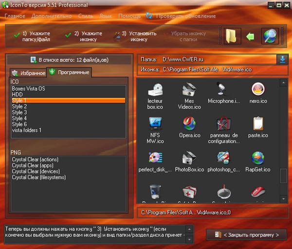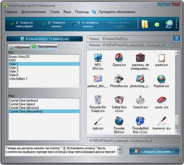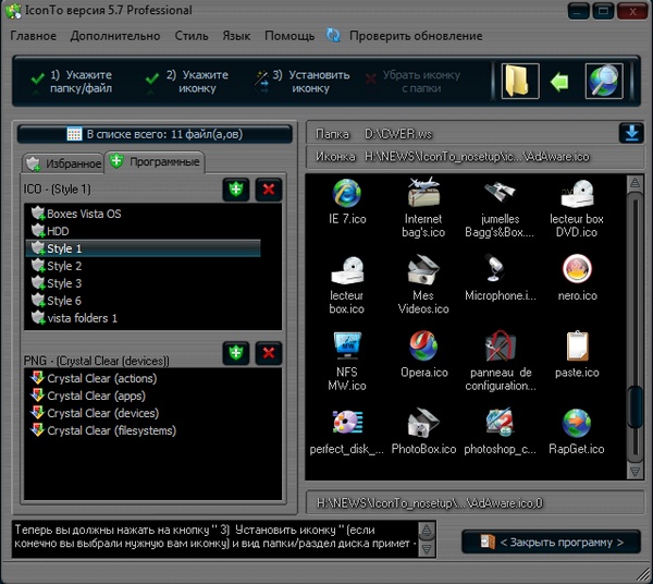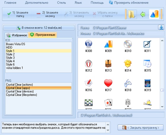 Программа IconTo предназначена для быстрого и удобного изменения вида значка папок и разделов диска на любые указанные вами (ICO, CUR, ICL или из ресурсов DLL, EXE и т.д.) в операционных системах семейства Windows. Для более быстрого доступа к избранным значкам в IconTo содержится небольшой список системных ресурсов Windows, в которых находятся значки, список, который, можно пополнять самостоятельно. Так же, в программе присутствуют встроенные значки, состоящие из разных стилей и подходящие под разные операционные системы, количество которых превышает 300 штук.