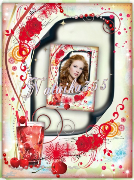 Женская многослойная рамка с розами, жемчужными нитями и стаканчиком освежающего напитка с вишнями.