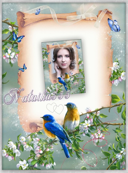 Фоторамка на сером фоне с веточками цветущего дерева и двумя птичками, все на отдельных слоях.