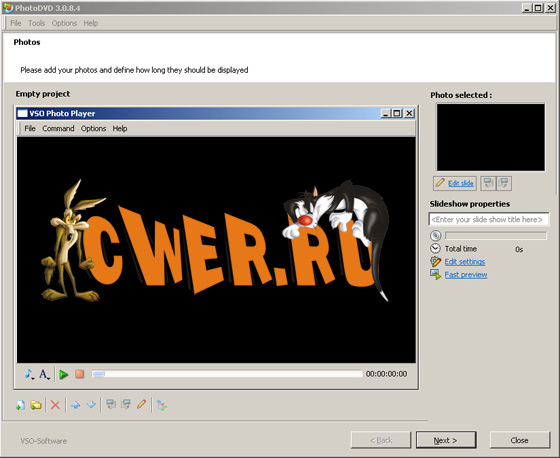 VSO PhotoDVD - программа для создания анимированных слайд-шоу для записи на DVD — очень проста в использовании и при этом обладающая широкими возможностями. Позволяет использовать для создания слайд-шоу файлы в наиболее популярных форматах - JPG, GIF, BMP, ANI, PCX, EMF, WMF и т.д., добавляя в качестве сопутствующего саундтрека файлы форматов MP3, WMA, OGG, MPC, WAV и APE. Имеется поддержка вывода данных в форматах FullScreen (4:3) и Widescreen (16:9).