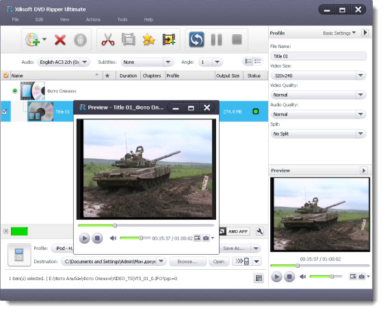 Xilisoft DVD Ripper Ultimate - мощная и удобная в использовании программа для копирования DVD-дисков с возможность конвертирования содержимого в соответствующие аудио и видео файлы типа AVI, MPEG, WMV, DivX, MP4, H.264, RM, MOV, M4V, XviD, 3GP, MP3, WMA, WAV, RA, M4A, AAC, AC3, OGG и т.д. Утилита способна создавать файлы, совместимые с iPod, iPhone, PSP, Apple TV и прочими портативными устройствами. Имеются опции конвертирования сегментов клипа, изменения размеров, наложения эффектов, добавления логотипов, предпросмотра результатов. Присутствует пакетная обработка файлов, получение информации из Интернет-баз и многие другие возможности.