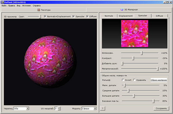 PixPlant — автономная программа и плагин к Photoshop-совместимым приложениям. Это мощный и удобный инструмент для создания высококачественных бесшовных текстур любого размера из любых изображений. При создании текстуры можно указывать, должна ли она быть бесшовной по горизонтали и/или по вертикали, исключать из процесса генерации некоторые части исходного изображения, задавать повторяемость и другие параметры.