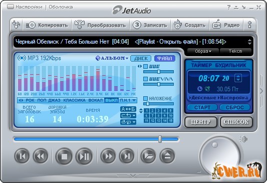 JetAudio - программа, которая является, пожалуй, самым навороченным и мощным из мультимедийных центров - целая аудио/видеосистема. Умеет проигрывать MP3, MP2, WAV, MID, REAL AUDIO/VIDEO, S3M, MOD, MPG, AVI, MOV, Video/Audio CD, RealPlayer G2 и некоторые другие форматы мультимедийных файлов. Jet-Audio способен применять встроенные 3D-звуковые фильтры к любому аудиоисточнику (есть фиксированные настройки Room, Hall, Stage, Stadium), кроме этого, у программы имеются шестиполосный эквалайзер и регуляторы Reverb и 3D, позволяющие добиться наилучшего качества звука.