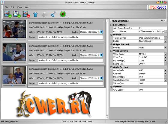 Утилита конвертирует различные видеофайлы в формат iPod. Таким образом, на iPod или iPhone можно записать любые фильмы и носить их с собой. Одной из главный особенностей iPodRobot Video Converter является то, что нагрузка на процессор полностью регулируется пользователем: в его праве присвоить любой авторитет процессу конвертации...