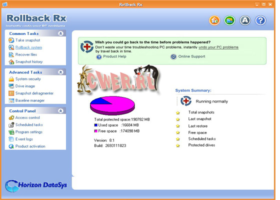 Вышла новая версия самой популярной программы - RollBack Rx, которая поможет защитить ваш компьютер от сбоя , неправильно установленного драйвера, поражения любого вируса, и вернуть обратно исправную систему за считанные минуты. RollBack Rx™ не влияет на производительность и занимает всего 0.07 % диска, и при этом позволяет без перезагрузки сделать автоматически или вручную менее чем за 3 секунды полный снимок системы, всего таких снимков можно сделать до 60 000, в любой из которых вы можете быстро вернуться или вернуть из них утерянные или разрушенные данные.