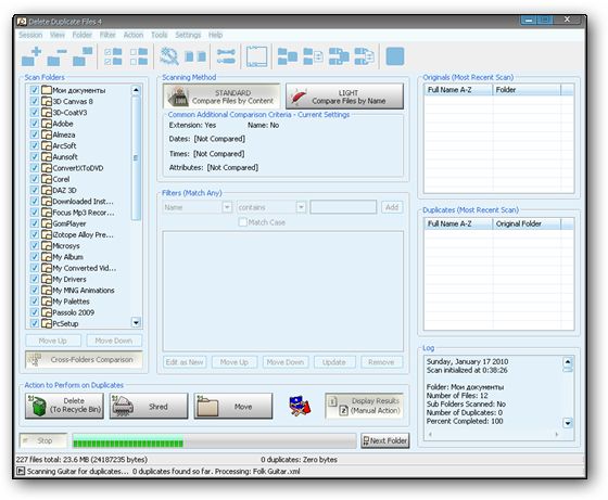 Duplicate File Detector - это мощный инструмент для поиска дубликатов файлов на вашем компьютере. Вы сможете найти дубликаты файлов любых типов, будь то графические, музыкальные, текстовые или двоичные файлы. Используемые в программе алгоритмы позволяют быстро анализировать содержимое как небольших по размеру файлов, так и больших файлов. Для определения дубликатов можно использовать следующие критерии: имя файла, размер файла, либо его содержимое. Для мультимедиа файлов в качестве критериев также можно использовать теги Артист, Альбом, Название песни, Комментарии к песне.