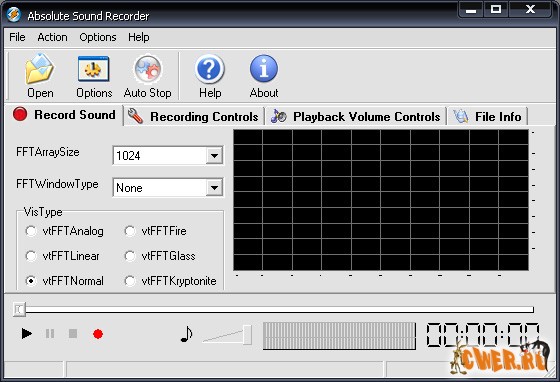 Absolute Sound Recorder - позволяет записать звук с любого источника: микрофон, линейный вход, аудио сигналы из Интернет, аудио/видео проигрывателя, игрушек и любой другой звуковой сигнал который поступает на звуковую карту. Записанный звук Absolute Sound Recorder может сохранить в большинстве распространенных аудио форматах, среди которых WAV, MP3, WMA и т.д.