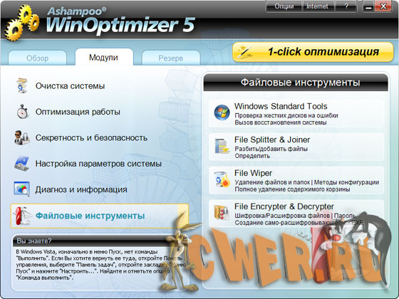 Удобная программа для оптимизации работы Windows. WinOptimizer залезет в самые труднодоступные уголки системы и прочистит их от не нужного мусора. Электронный чистильщик займется ненужными (или дублирующимися) файлами на жестком диске, удалит некорректные ключи из системного реестра, расчистит склад запылившихся файлов в во временном интернет-каталоге, настроит сетевые функции, а также проверит файловые ассоциации, настроит работу библиотек DLL и займется списком программ, загружающихся при запуске операционной системы - среди них тоже бывает много лишних.