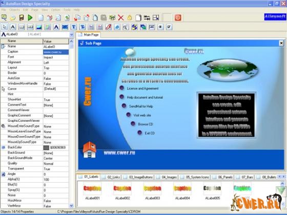 Профессиональная программа, позволяющая создавать разнообразные загрузочные меню (autorun) для записываемых вами компакт-дисков. Программа имеет много встроенных шаблонов. Меню представляют из себя исполняемый (exe) файл, можно встроить свою картинку, практически любые виды меню, текст, графику. Программа имеет достаточно простой интерфейс.