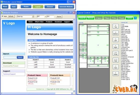 Вы можете быстро и легко создать веб-страничку с Website Layout Maker . Для создания веб-страницы просто перетяните мышкой готовые формы на главное поле. Это значительно упрощает создание веб страницы. Вы можете также использовать три этапа для создание страницы: Тема, Формат и Элемент. Т.е. сначала вы выбираете тему из различных готовых тем. Затем форматируете, устанавливая нужные размеры. И наконец выбираете элементы, например затемнение фона. Вы можете использовать все эти этапы с предварительным просмотром. Страница, сделанная Website Layout Maker, полностью совместима с Internet Explorer и Firefox.