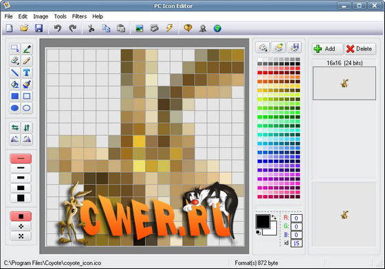 IconoMaker - программа для создания и редактирования иконок. Позволяет изготавливать как стандартные (16x16, 32x32, 48x48), так и произвольного размера иконки с глубиной цвета до 16 млн., включая для ОС Windows XP в 32-bit.