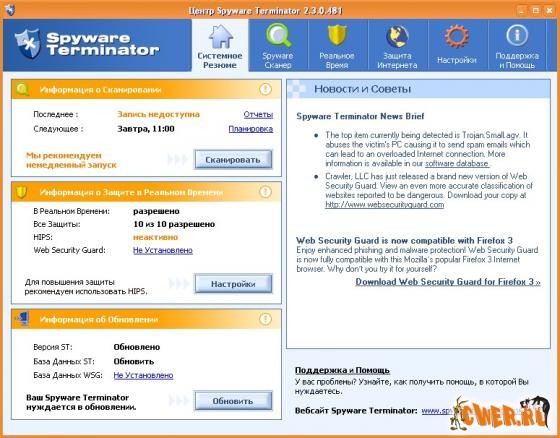 Spyware Terminator – мощный adware и spyware сканер с защитой в реальном времени, который может обнаруживать, удалять или изолировать spyware, adware, Троянов, кейлоггеров, похитителей персональных данных и другие возможные угрозы. Сканирование может быть настроено по желанию пользователя. В состав Spyware Terminator входит планировщик, а также защита в реальном времени для вашего браузера, хост-файлов, данных автозапуска и других системных областей.