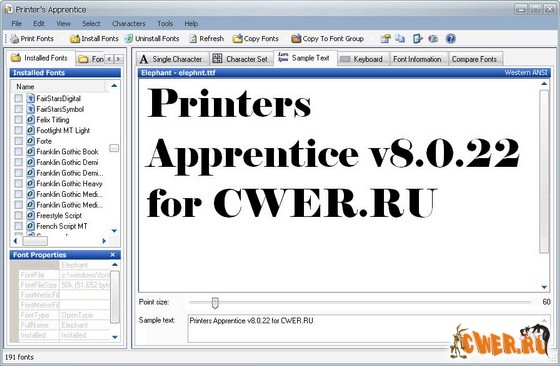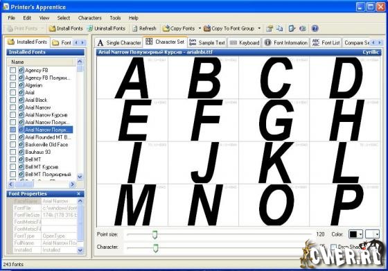 Printers Apprentice представляет из себя потрясающий менеджер шрифтов для операционных систем Windows. Если вы являетесь художником, профессиональным публицистом или просто программным энтузиастом, и если у вас на компьютере имеется большое количество разнообразных шрифтов, то данная программа поможет вам в организации вашей коллекции. Программа поддерживает работу с шрифтами форматов TrueType, Adobe Type, и OpenType. С помощью этой утилиты вы сможете просматривать, сравнивать и выводить на печать ваши шрифты, установленные в системе. Также программа позволяет просматривать шрифты в указанных директориях, которые еще не установлены в систему, но хранятся на жестком диске - для этого в программу встроен браузер для просмотра шрифтов из указанного хранилища. Вы можете устанавливать и удалять шрифты намного быстрее, проще и удобнее с данной программой, чем это делаете через панель управления.