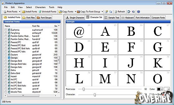 Printer's Apprentice - это современный 32-битный менеджер шрифтов для Windows. С его помощью можно просматривать неустановленные шрифты, печатать образцы TrueType, Type 1 и OpenType шрифтов, распечатывать каталоги шрифтов в разных форматах и устанавливать (или удалять) группы шрифтов всего за несколько кликов. Сильной стороной программы является способность легкой работы с неустановленными шрифтами, находящимися на CD или на диске. Printer's Apprentice может распечатывать точнейшие листинги с CD, не устанавливая оттуда ни единого шрифта.