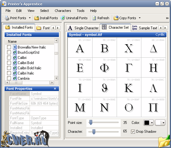 Printers Apprentice - программа представляет из себя потрясающий менеджер шрифтов для операционных систем Windows. Если вы являетесь художником, профессиональным публицистом или просто программным энтузиастом, и если у вас на компьютере имеется большое количество разнообразных шрифтов, то данная программа поможет вам в организации вашей коллекции. Программа поддерживает работу с шрифтами форматов TrueType, Adobe Type, и OpenType. С помощью этой утилиты вы сможете просматривать, сравнивать и выводить на печать ваши шрифты, установленные в системе. Также программа позволяет просматривать шрифты в указанных директориях, которые еще не установлены в систему, но хранятся на жестком диске - для этого в программу встроен браузер для просмотра шрифтов из указанного хранилища. Вы можете устанавливать и удалять шрифты намного быстрее, проще и удобнее с данной программой, чем это делаете через панель управления.