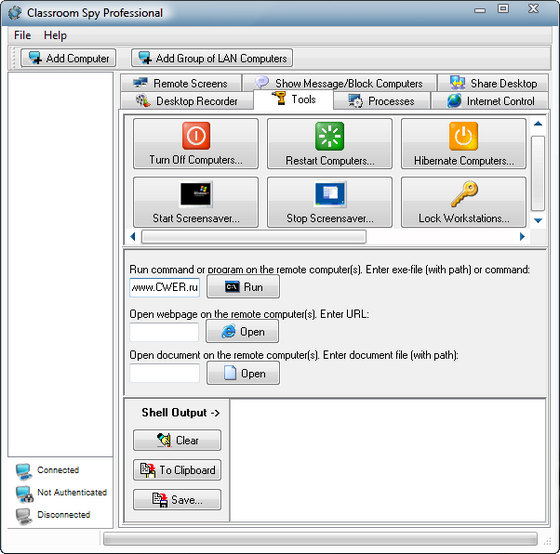 Network LookOut Net Monitor for Employees Professional позволяет увидеть экраны компьютеров, соединённых по сети. Таким образом, Вы сможете увидеть, чем занимаются ваши служащие! Кроме того, имеется возможность управления мышью и клавиатурой удалённого компьютера, также можно посылать уведомления или заблокировать компьютер. Программа работает через Интернет, агент может быть установлен удалённо.