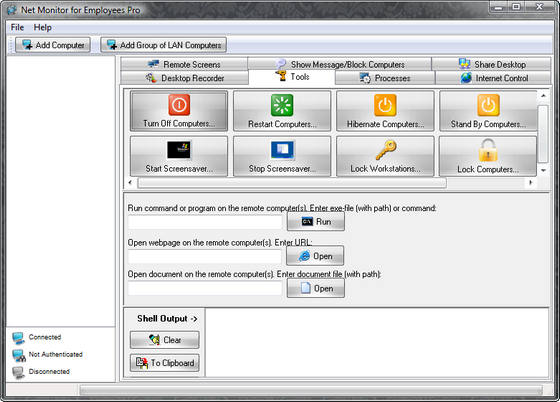 Network LookOut Net Monitor for Employees Professional позволяет увидеть экраны компьютеров, соединённых по сети. Таким образом, Вы сможете увидеть, чем занимаются ваши служащие! Кроме того, имеется возможность управления мышью и клавиатурой удалённого компьютера, также можно посылать уведомления или заблокировать компьютер. Программа работает через Интернет, агент может быть установлен удалённо.