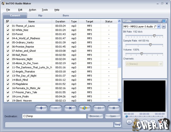 ImTOO Audio Maker - программа из разряда все в одном - это и аудио конвертер, граббер аудио CD, прожиг аудио CD. Особенностью данной программы является поддержка MPEG, WMV, ASF, AVI, MOV, MP3, 3GP, RM, MP2, MP3, WMA, WAV, AU, M4A, RA, OGG, AAC, AC3, MPG, DAT, VOB, QT и других аудио форматов. Конвертор между форматами, производит пакетный режим конвертирования, извлекает аудио из видео файлов, аудио из аудио CD, создает и прожигает аудио CD, создает и редактирует ID3 (ID3V1, ID3V2) тэги, высокая скорость и качество, приятный и простой интерфейс.