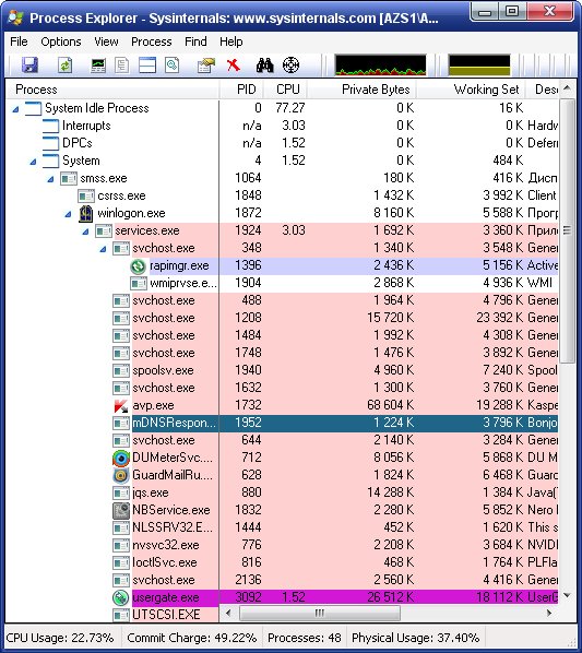 Process Explorer - компактная, но мощная программа с удобным интерфейсом для мониторинга в режиме реального времени происходящих в системе процессов. Выдает подробнейшую информацию обо всех запущенных процессах, включая владельца, использование памяти, задействованные библиотеки и т.д.