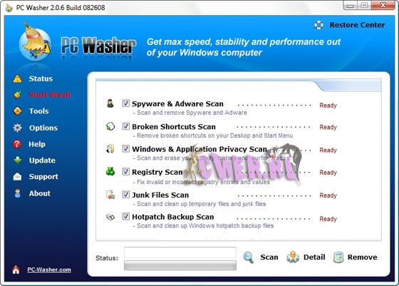 PC Washer - программа, которая просканирует вашу систему и выдаст в процентном отношении её захламленность для принятия пользователем решения. Программе известно более 80 видов ненужных файлов, которые он готов удалить переместив их в корзину. PC Washer заставит вашу систему стать более устойчивой и работать быстрее, автоматически очищая ее от: временных интернет файлов и файлов оставленных программами; ненужных логов и файлов резервного копирования; пустых (нулевых) файлов; index.dat файлов; битых ярлыков; недействительных записей реестра и т.д.