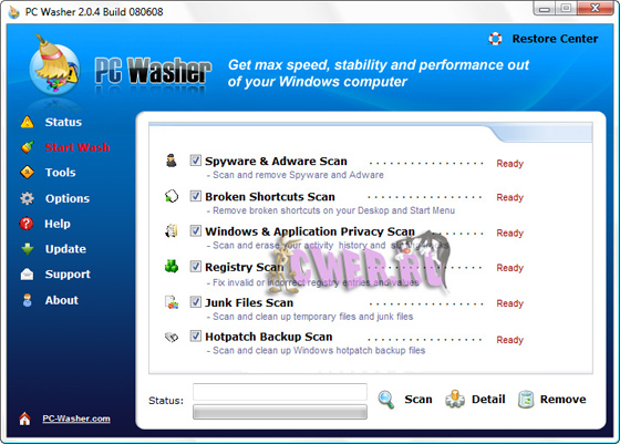 PC Washer - данная программа просканирует вашу систему и выдаст в процентном отношении её захламленность для принятия пользователем решения. Программе известно более 80 видов ненужных файлов, которые он готов удалить переместив их в корзину. PC Washer заставит вашу систему стать более устойчивой и работать быстрее, автоматически очищая ее от: временных интернет файлов и файлов оставленных программами; ненужных логов и файлов резервного копирования; пустых (нулевых) файлов; index.dat файлов; битых ярлыков; недействительных записей реестра и т.д.